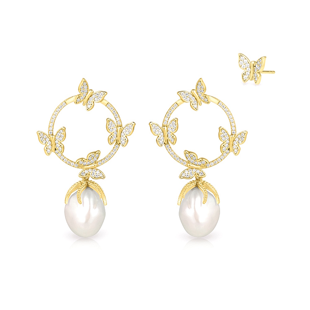 Bezaubernde Perlen Ohrringe mit Schmetterlingen aus vergoldetem Silber, akzentuiert mit Zirkonia.